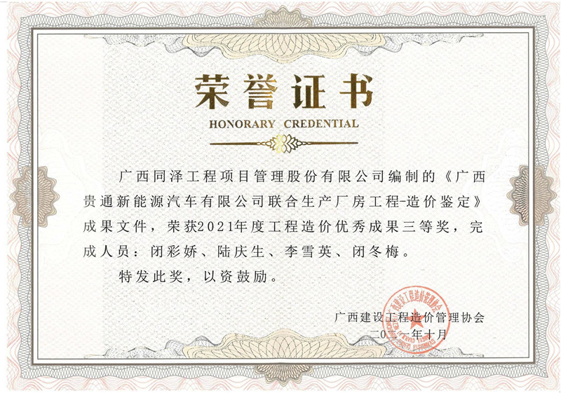 《廣西貴通新能源汽車廠房造價(jià)鑒定項(xiàng)目》榮獲2021年度工程造價(jià)優(yōu)秀成果三等獎(jiǎng)