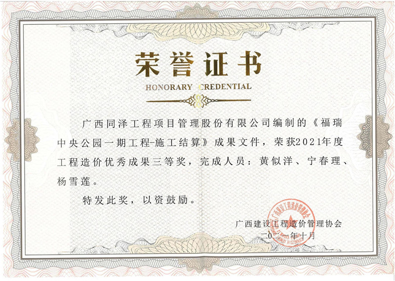 《福瑞中央公園一期工程-施工結(jié)算》榮獲2021年度工程造價(jià)優(yōu)秀成果三等獎(jiǎng)