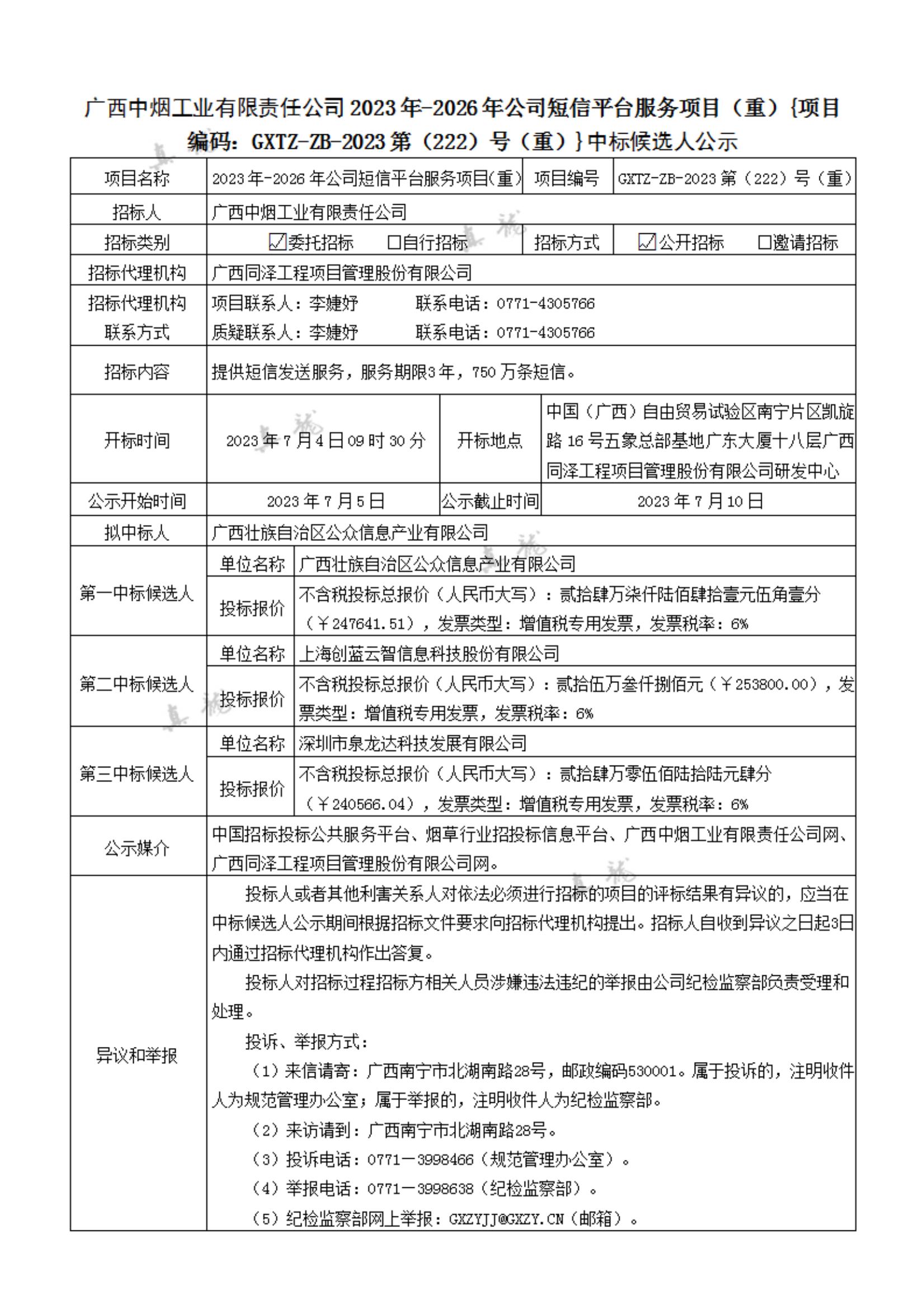 廣西中煙工業(yè)有限責(zé)任公司2023年-2026年公司短信平臺服務(wù)項目(重){項目編碼:GXTZ-ZB-2023第(222)號(重)}中標候選人公示