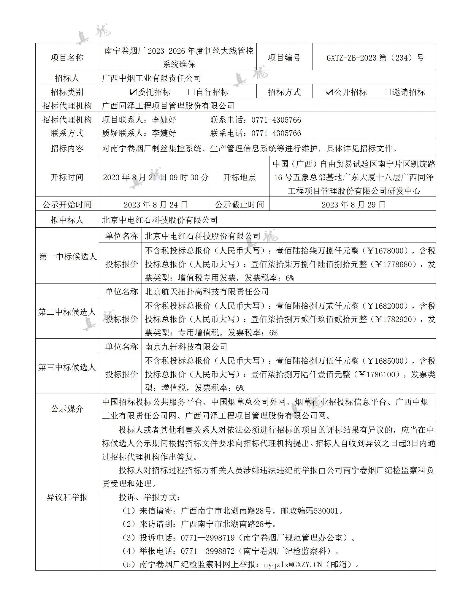 廣西中煙工業(yè)有限責(zé)任公司南寧卷煙廠2023-2026年度制絲大線管控系統(tǒng)維保(項(xiàng)目編號(hào):GXTZ-ZB-2023第(234)號(hào))中標(biāo)候選人公示