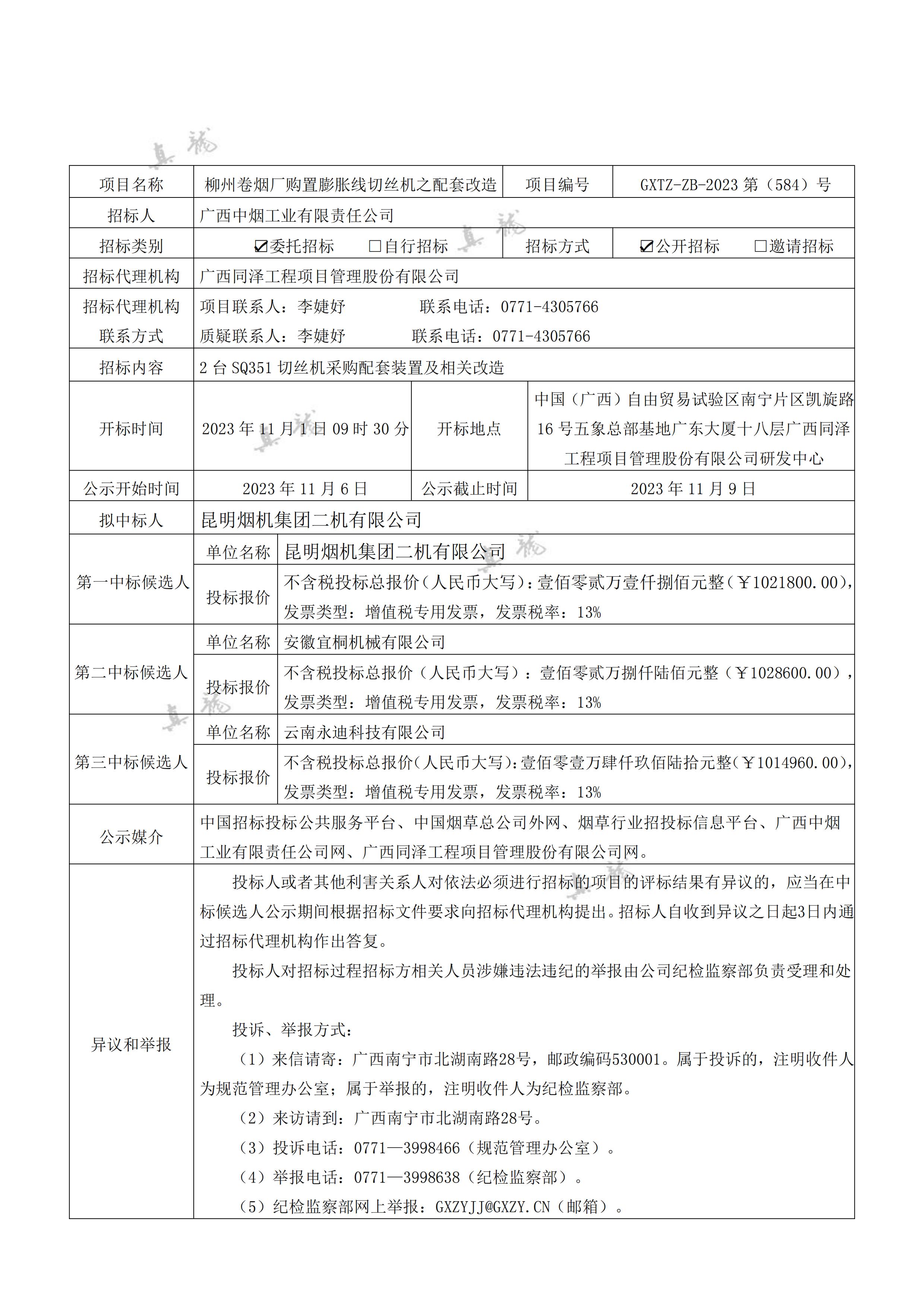 廣西中煙工業(yè)有限責(zé)任公司柳州卷煙廠購(gòu)置膨脹線切絲機(jī)之配套改造(項(xiàng)目編號(hào):GXTZ-ZB-2023第(584)號(hào))中標(biāo)候選人公示