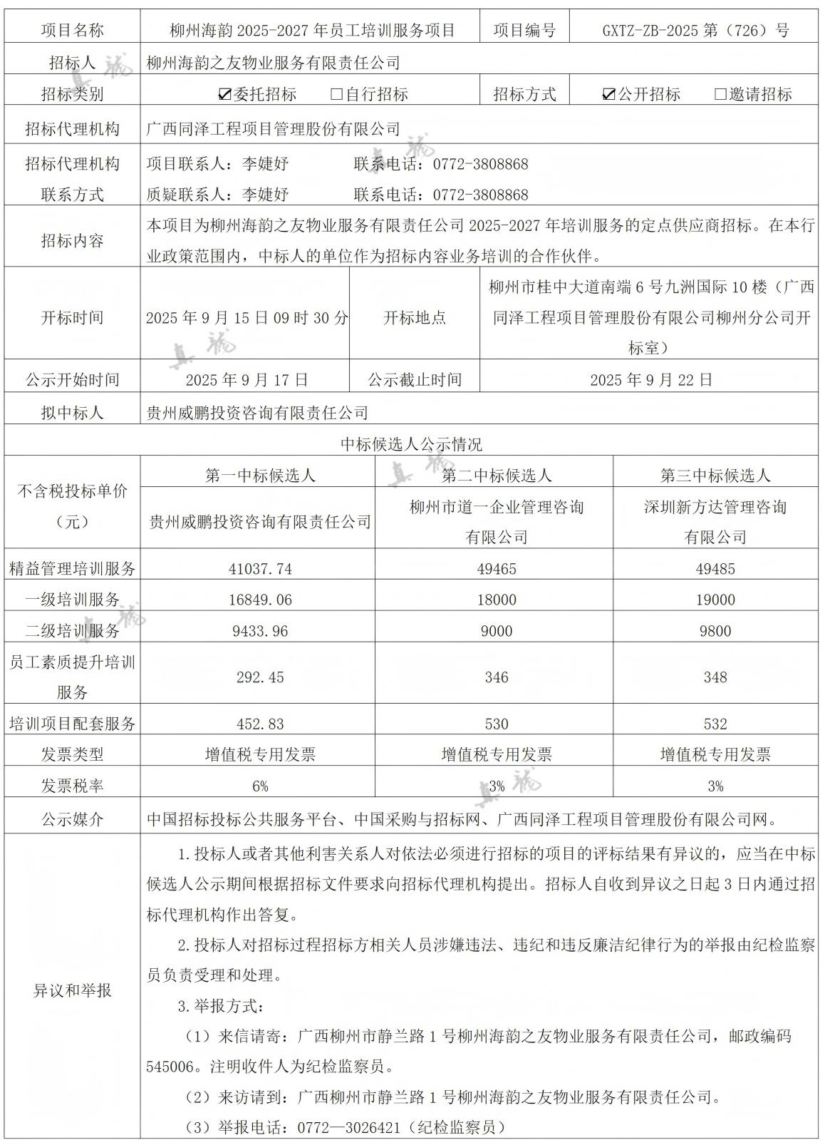 柳州海韻之友物業(yè)服務(wù)有限責(zé)任公司柳州海韻2025-2027年員工培訓(xùn)服務(wù)項(xiàng)目(項(xiàng)目編號:GXTZ-ZB-2025第(726)號)中標(biāo)候選人公示