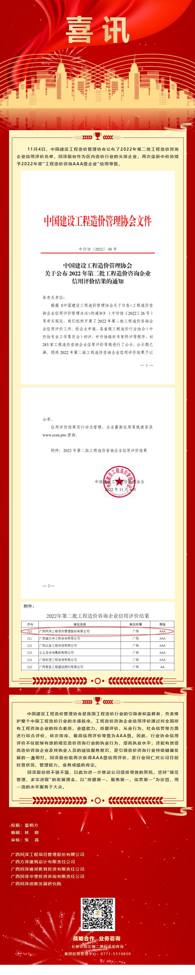 喜訊丨同澤股份榮獲中價(jià)協(xié)授予2022年度“工程造價(jià)咨詢AAA級企業(yè)”信用等級